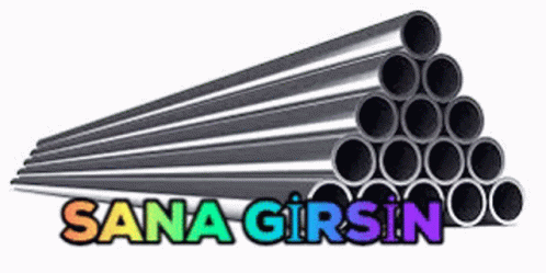 A stack of metal pipes with the Turkish phrase 'Sana Girsin' overlaid on the image.