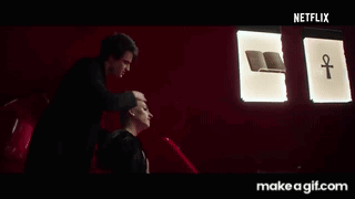 Dream (Morpheus) holds Desire in a dramatic scene from The Sandman, set in a dark, red-lit room.