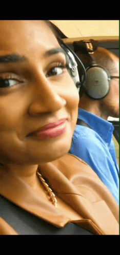 Sanjana Ganesan, a Bollywood actress, winks playfully while wearing headphones and a brown jacket.