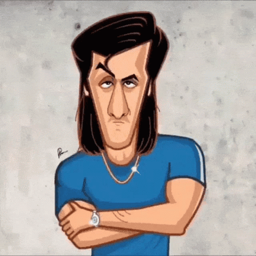 A cartoon caricature of Sanju, a man with gray hair, a mustache, and a red tilak on his forehead.