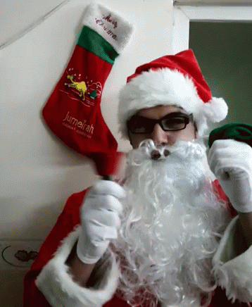 A man dressed as Santa Claus rings a bell, then removes his hat and glasses, revealing his face.