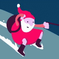 Animated Santa Claus skis down a snowy hill, wearing boxer shorts with hearts and a red jacket.