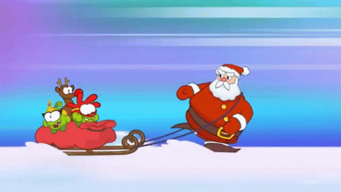 Santa Claus, Om Nom, and a Rudolph-dressed character on a sleigh, tossing a gift.