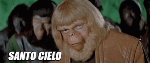 An ape from Planet of the Apes reacts with 'Santo Cielo' (Good Heavens), showing surprise or disbelief.