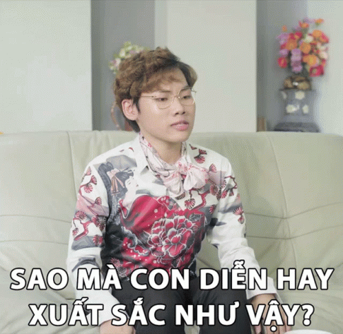 Hoàng Siêm sits on a couch, asking why he acts so well and excellently, showcasing his confident performance.