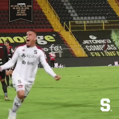 Deportivo Saprissa player celebrates a goal on the field, showing team spirit and excitement.