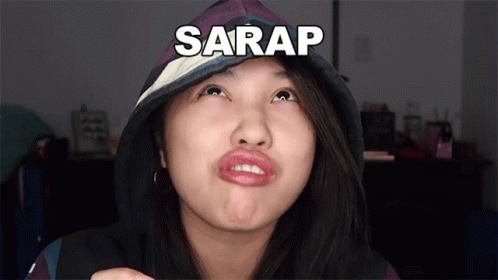 Woman in hoodie reacts to something delicious with 'Sarap' text on screen, possibly related to Isseymiyake Parto.