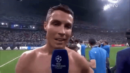 Cristiano Ronaldo, shirtless after a match, speaks into a Champions League microphone, performing his iconic 'Siuuu' celebration.