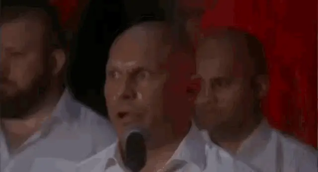 A mascot dances in front of a red banner promoting Shariy in the city, with balloons and fireworks imagery.