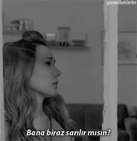 A woman looks out a window in a poignant black and white scene, with the caption "Will you hug me a little?"