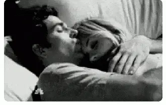 A man and a woman share an intimate moment, cuddling and kissing in bed in a black and white scene.