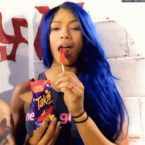 Sasha Banks, with vibrant blue hair, enjoys a spicy Takis-flavored lollipop while holding a bag of Takis.