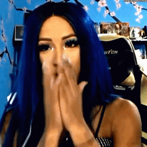 Sasha Banks, with blue hair, reacts emotionally, covering her mouth before smiling warmly.