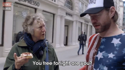 A sassy grandma is asked 'You free tonight?' by a man in an American flag shirt on a city street, holding a donut.