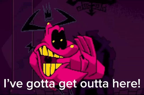 Satan Antonblast, a pixel art character, exclaims 'I've gotta get outta here!' before running away.