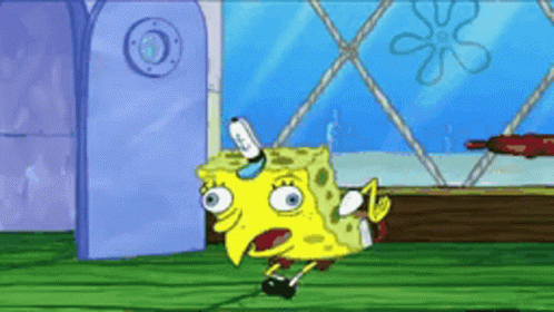 Spongebob Squarepants, in his distorted 'Saturnoir' form with a bird head, runs erratically.