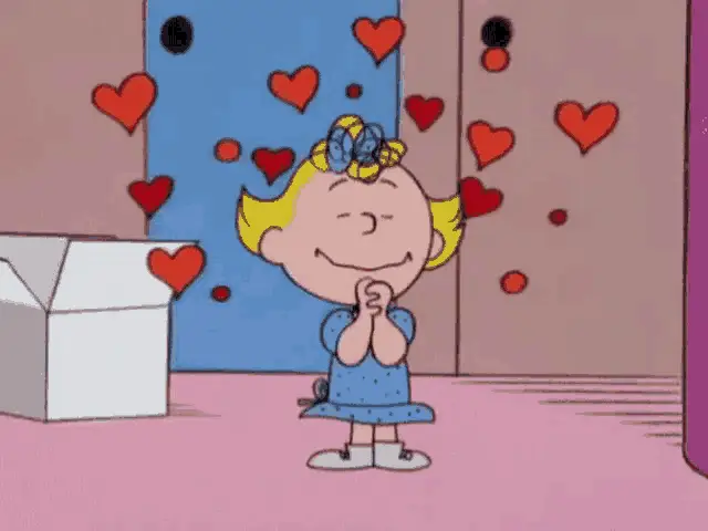 Donald Duck is sitting in front of a fireplace, looking lovestruck with hearts in his eyes and on the mantelpiece.