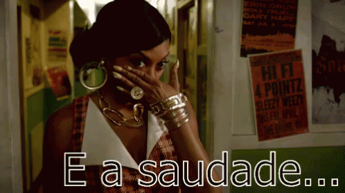 A woman wipes away tears with the Portuguese caption 'E a saudade...' (And the longing...) overlaid.