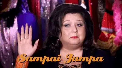 Woman in traditional Batak attire cheerfully gestures while saying 'Hati hati di jalan' (Be careful on the road).