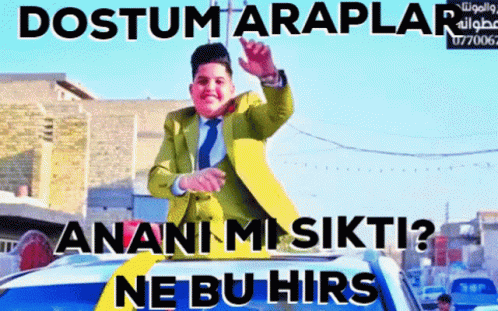 Man in a suit dancing on a car roof with Turkish text 'Dostum Araplar, Ananı mı sikti? Ne bu hırs' displayed.
