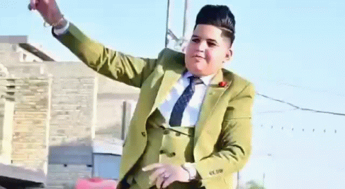 Young man in a stylish green suit and tie performs energetic dance moves at an Arab wedding celebration.