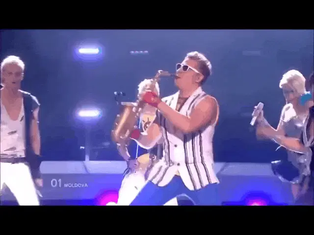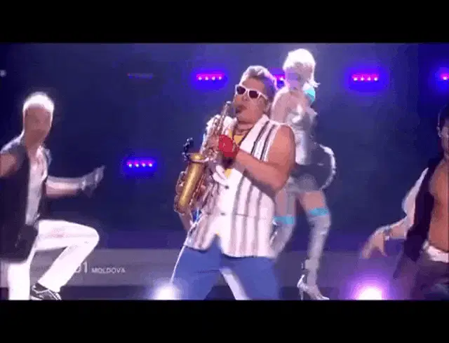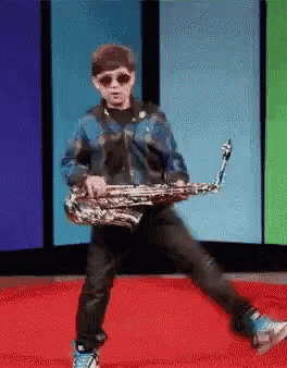 A young boy in sunglasses and a patterned jacket plays the saxophone and dances energetically on a red carpet.