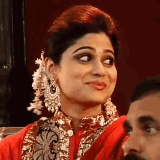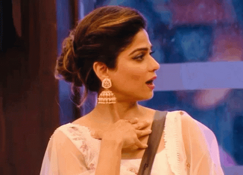Shamita Shetty looks surprised with an open mouth and hand on her chest, wearing traditional attire.