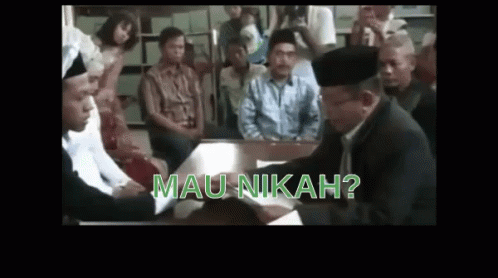 A man responds 'Saya Mau Pak' during an Islamic marriage ceremony (Akad Nikah) in Indonesia, surrounded by family.