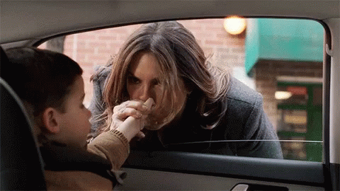 Mariska Hargitay as Olivia Benson shares a tender goodbye kiss with a child through a car window.