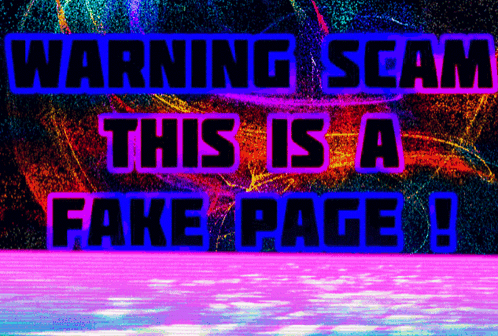 A clear warning message: 'WARNING SCAM THIS IS A FAKE PAGE!' displayed on a vibrant, colorful synthwave background.