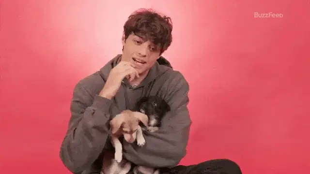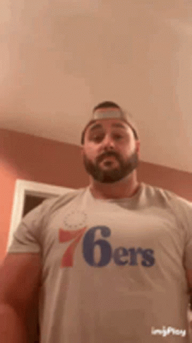 A man with a beard, wearing a 76ers shirt, performs a motorboat action, smiling at the camera.