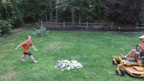 Mcjuggernuggetsgifs is scared as a boy tries to save CDs from being destroyed by a riding lawnmower.