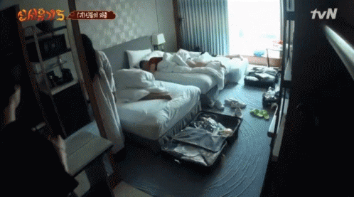 Ahn Jaehyun gets scared in a hotel room after someone appears behind him while he looks in the mirror.
