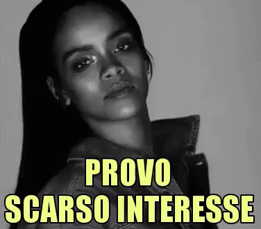 Rihanna looking unimpressed in a black and white photo, captioned 'I feel little interest' in Italian.