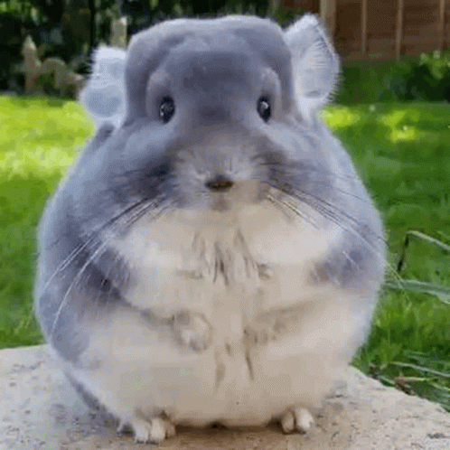 A fluffy gray and white Jisung Chinchilla stands on a rock, looking adorable with its prominent whiskers.