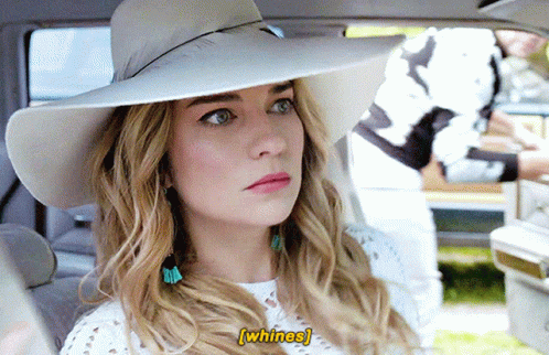 Alexis Rose from Schitt's Creek whines in a car, wearing a wide-brimmed hat and turquoise earrings.