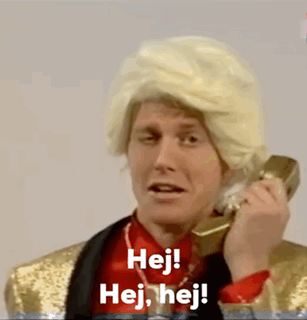 Peter Mygin as Scorekaj, wearing a blonde wig and gold jacket, talking on a vintage phone and saying 'Hej! Hej, hej!'