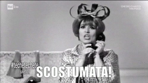 Franca Valeri as Sora Cecioni on the phone, exclaiming 'Scostumata!' in a classic Italian TV sketch.