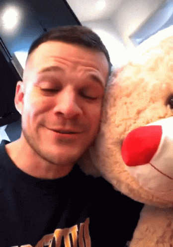 Scottryder smiles while holding an adorable teddy bear with a red nose, sharing sweet moments.