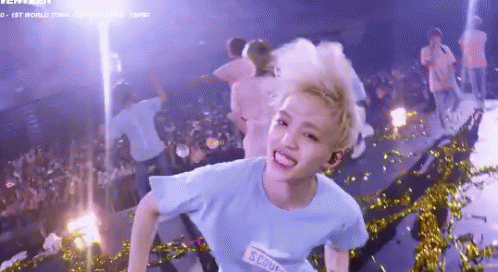 Scoups from Seventeen dances energetically on stage, smiling and sticking his tongue out amidst falling confetti.