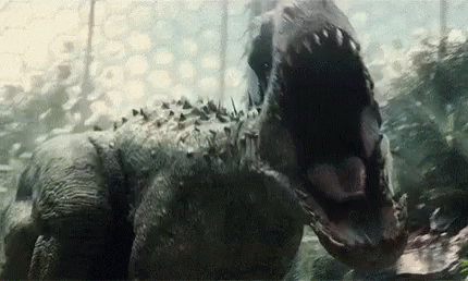A large dinosaur with its mouth wide open, appearing to roar or scream in a jungle setting.