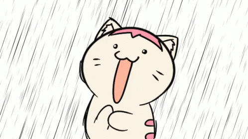 An animated white cat with pink markings stands in the rain, screaming with its mouth wide open.