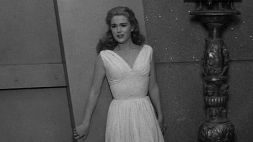 Adad, a woman in a white dress, appears terrified and distressed, hiding and crying in a classic film scene.