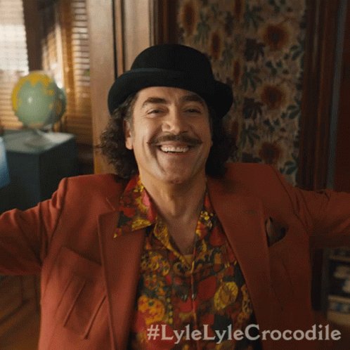 Javier Bardem as Hector Valenti, wearing a bowler hat and patterned shirt, enthusiastically screaming.