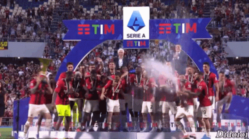 AC Milan players celebrate their Serie A 2021-22 championship win on a podium, raising the Scudetto trophy.