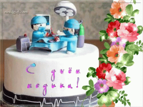 A festive cake celebrating Medical Worker's Day, featuring miniature surgeon figures and vibrant flowers.