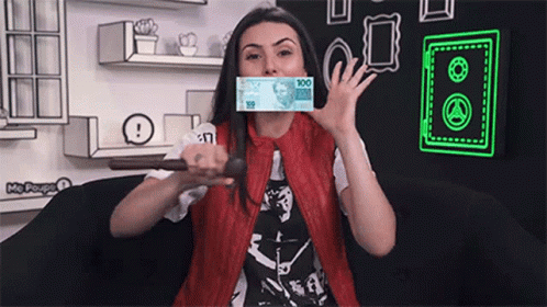 Nathalia Arcuri from Me Poupe holds a 100 Real bill, illustrating the phrase "Se Ferrou Se Lascou".