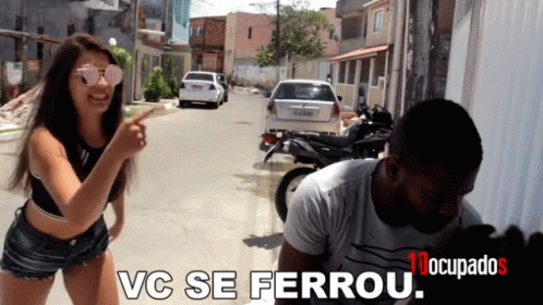 A woman points emphatically at a man, with the Portuguese caption 'VC SE FERROU' (You're screwed) displayed.