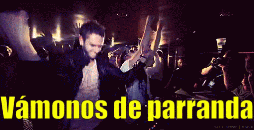 Two men dance energetically at a lively party, with the Spanish caption 'Vámonos de Parranda' (Let's Go Party), possibly featuring DJ Steve Aoki.
