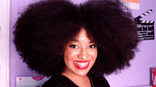 Joicy Eleiny smiling confidently, showcasing her large afro hairstyle with red lipstick.
